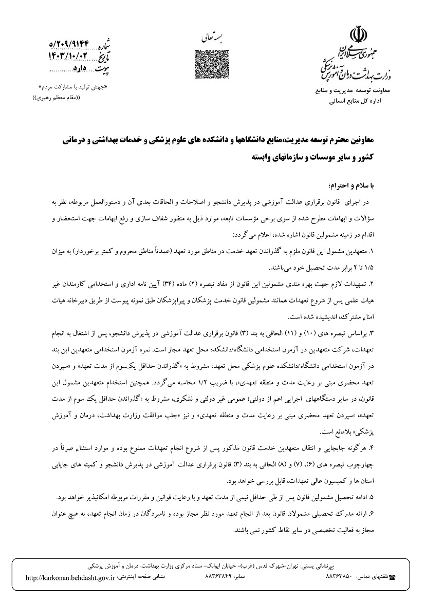 بخشنامه -شفاف سازي و رفع ابهامات مربوط به مشمولين قانون برقراري عدالت آموزشي / تمامي موسسات